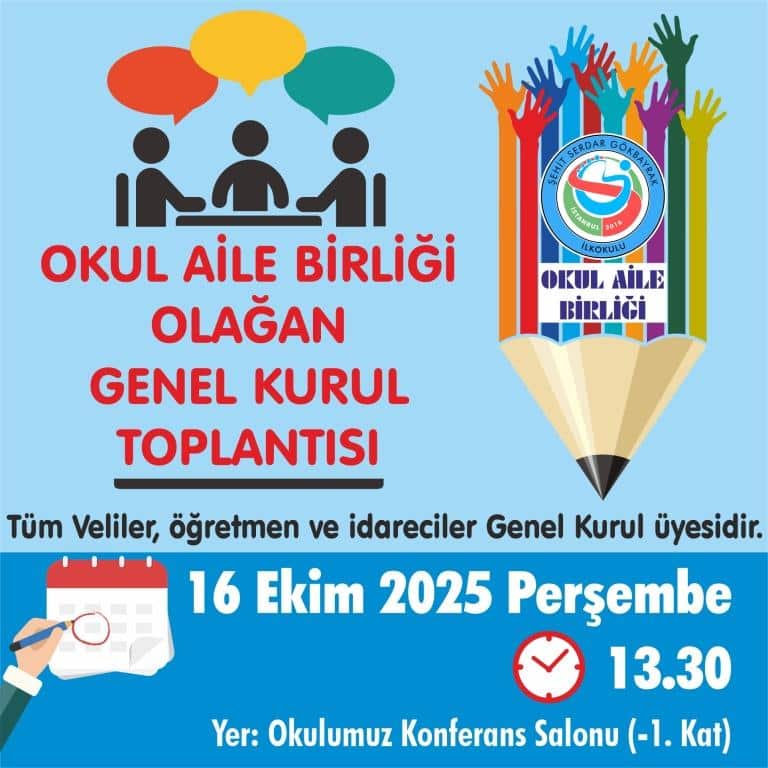 Okulumuz Okul Aile Birliği Yönetim ve Denetim Kurulunun belirleneceği Genel Kurul toplantısına tüm velilerimiz davetlidir.
